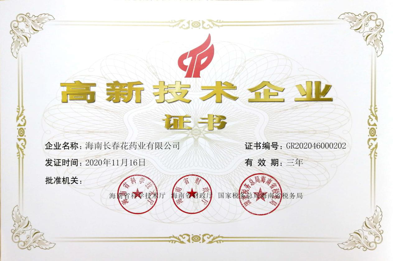 2020年12月28日,海南省科學技術廳發布了海南省2020年第二批高新技術企業認定的通知。海南長春花藥業有限公司成為通過認定的101家企業之一,成為五指山市第二家高新技術企業。