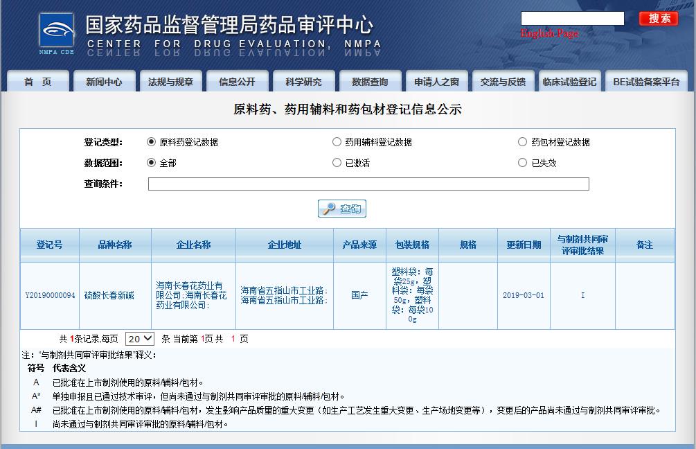 海南長(zhǎng)春花藥業(yè)旗下的“硫酸長(zhǎng)春新堿”原料藥于2019年3月1日獲得國(guó)家食品藥品監(jiān)督管理總局備案登記號(hào)(登記號(hào):Y20190000094 )。